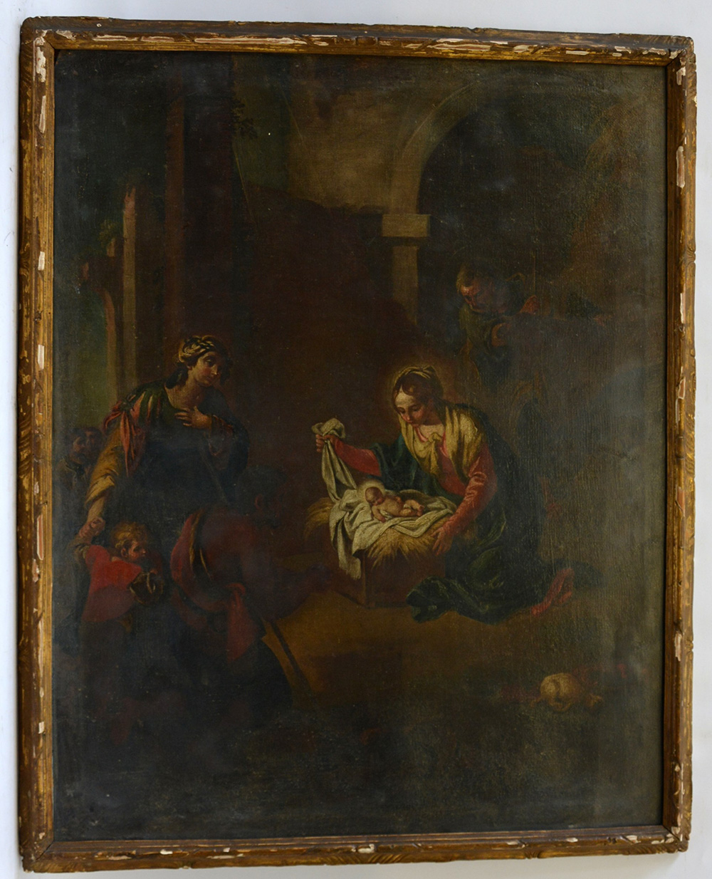 Scuola Italiana del secolo XVII "Adorazione di Gesù bambino" olio tela (cm 89x70,5) in cornice (difetti)