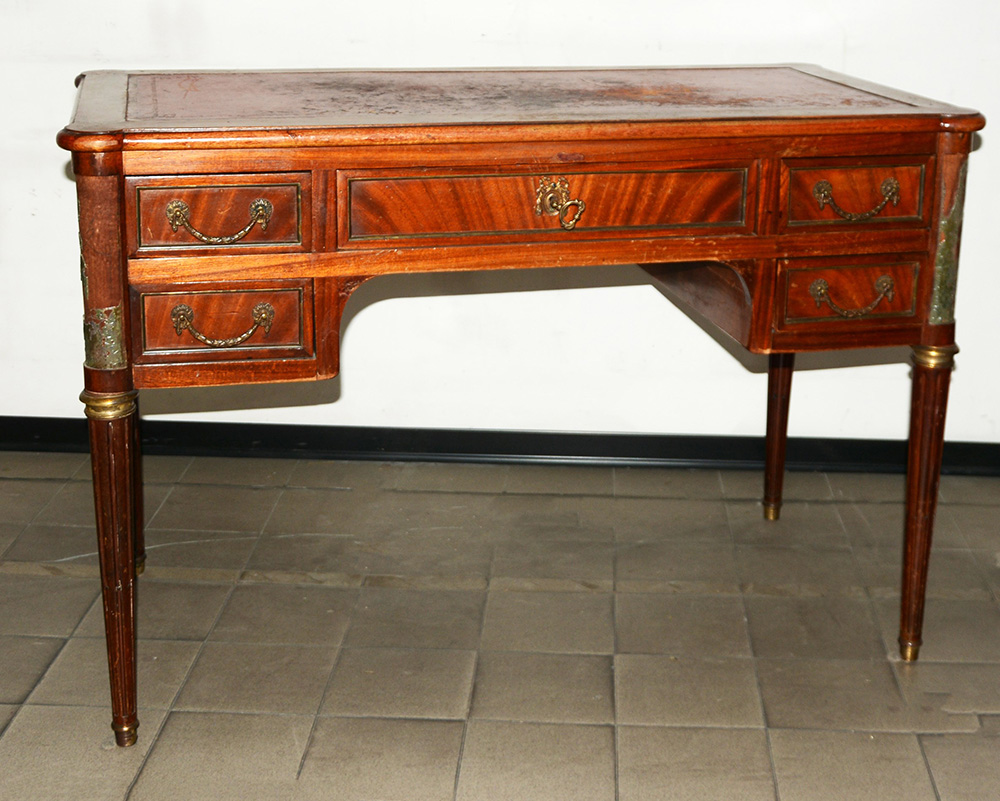 Scrivania a cinque cassetti con gambe scanalate decorate agli attacchi da fregi in ferro (cm 117x75x61) (difetti)