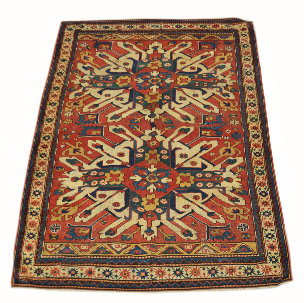 [Tappeti] Tappeto Kazak Adler, Caucaso, fine sec. XIX. Decoro con due medaglioni di ispirazione araldica nei toni del bianco, verde e blu su campo rosso (cm 216x151) (difetti e restauri)