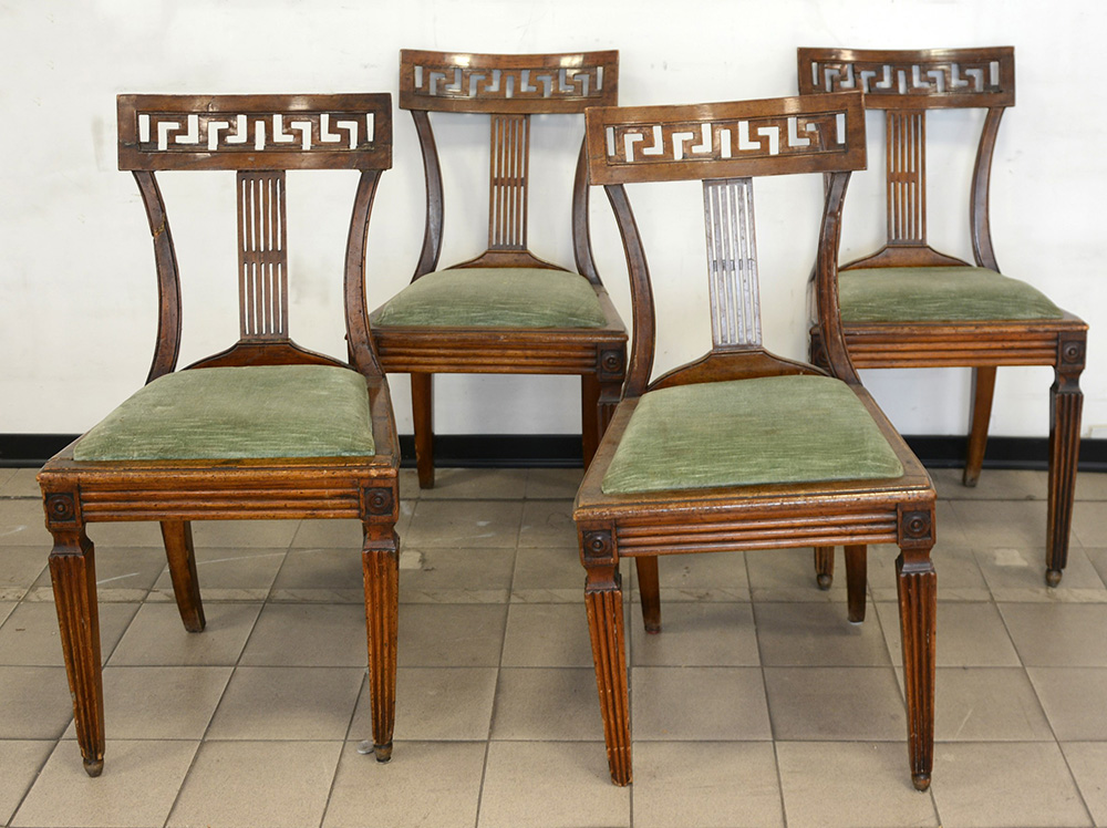 Gruppo di quattro sedie con schienale a giorno intagliato con greca. Sec. XIX (difetti e restauri)