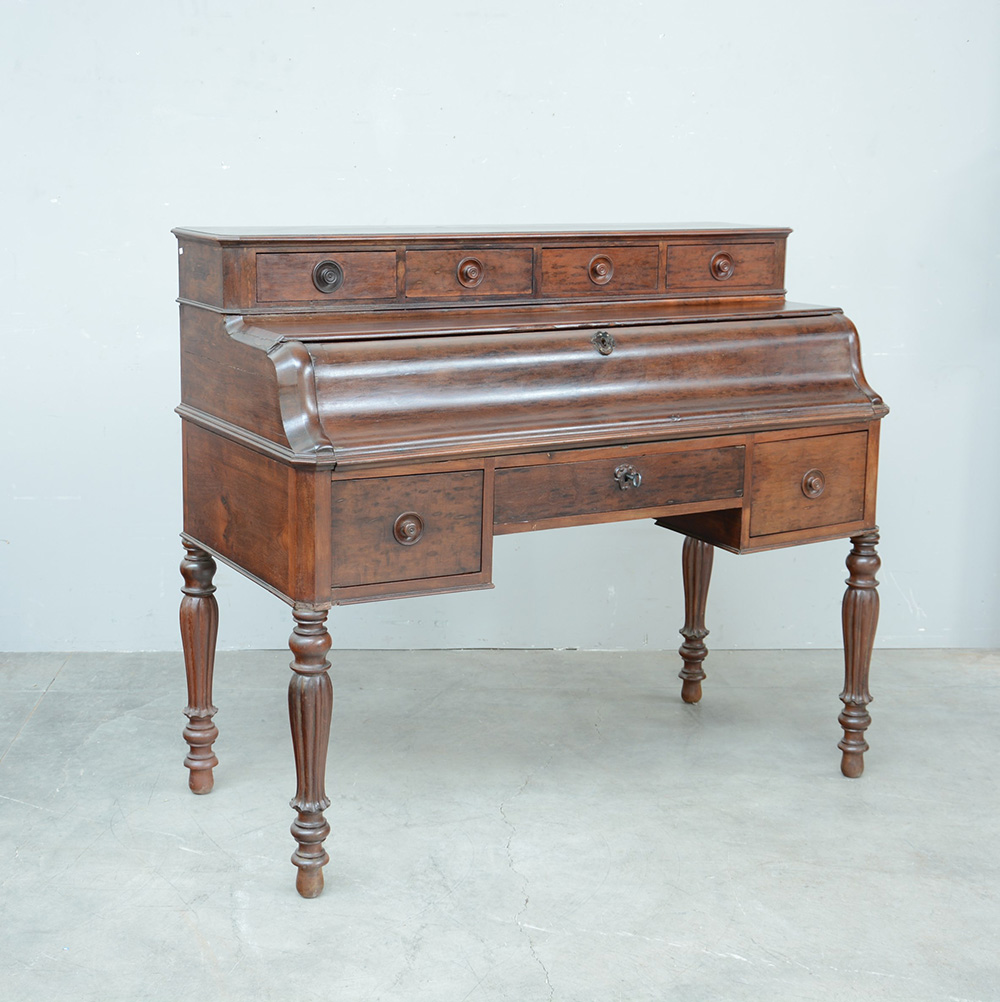 Scrittoio con alzata in mogano, parte superiore con tre cassettini in linea, parte inferiore a tre cassetti e antina ribaltabile celante cassettini e pianetto rivestito in velluto. Piedi torniti e scanalati, sec. XIX (cm 132x115x66) (difetti)
