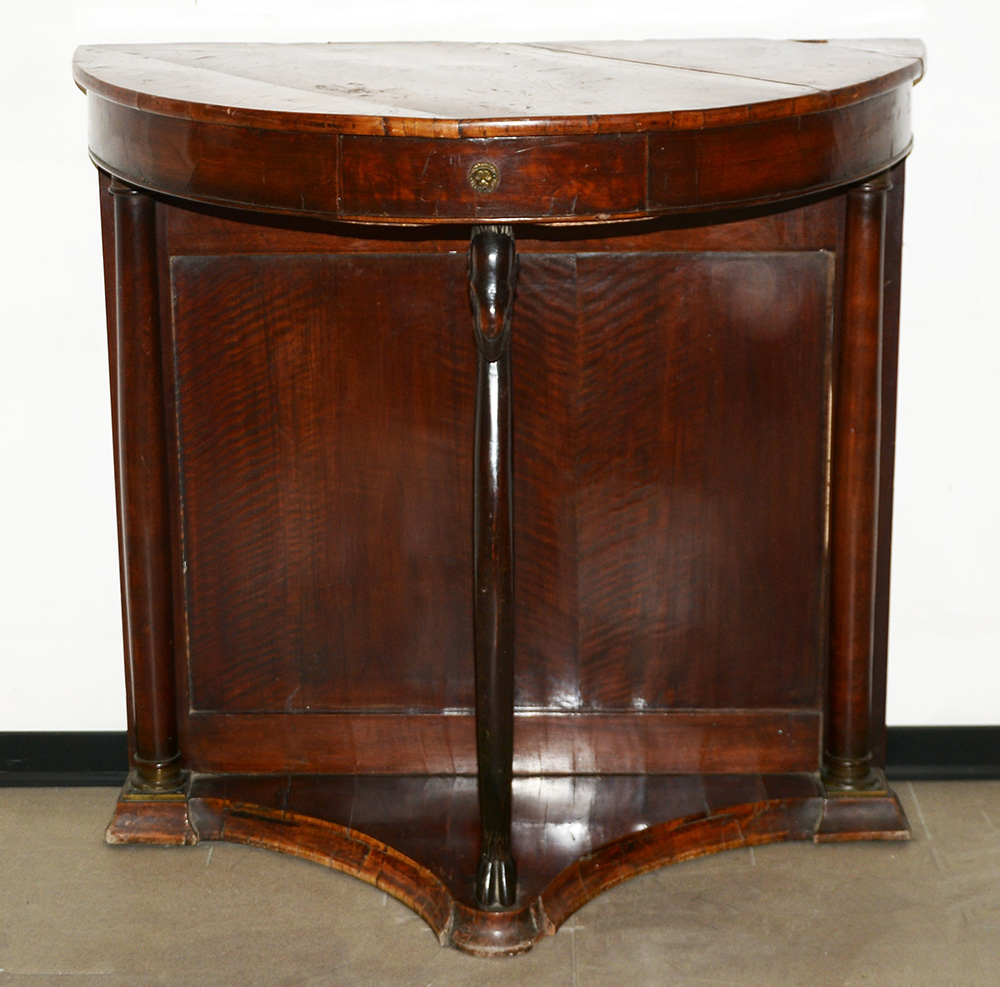 Consolle a mezzaluna in stile impero con cassetto sottopiano, due montanti a colonna e uno zoomorfo (cm 88x87x44) (difetti)