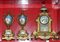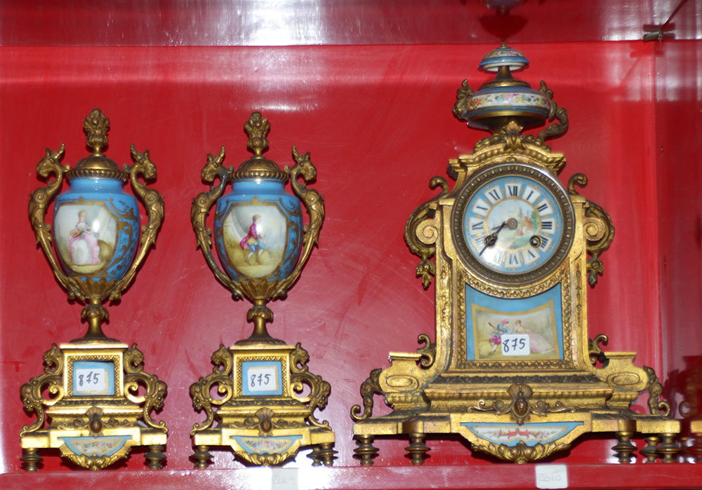 Trittico da camino in bronzo dorato e porcellana di Sevres a fondo blu decorata in policromia con scene galanti, uccelli, paesaggi, fiori e fregi dorati. Composta da pendola con quadrante a numeri romani e due vasi biansati. Francia, inizio sec XX (difetti)