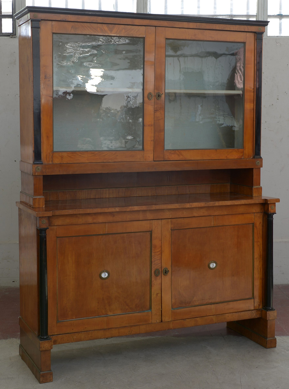 Mobile a due corpi in noce a quattro ante di cui le superiori a vetri, montanti inferiori a colonna piena ebanizzata sec XIX (cm 150x200x48) (difetti)
