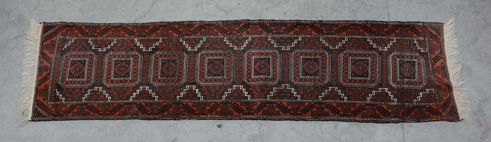 [Tappeti] Tappeto Baluchistan, Persia, sec. XX. Disegno geometrico a Gull nei toni del bianco, marrone e mattone (cm 303x77)(difetti e restauri)
