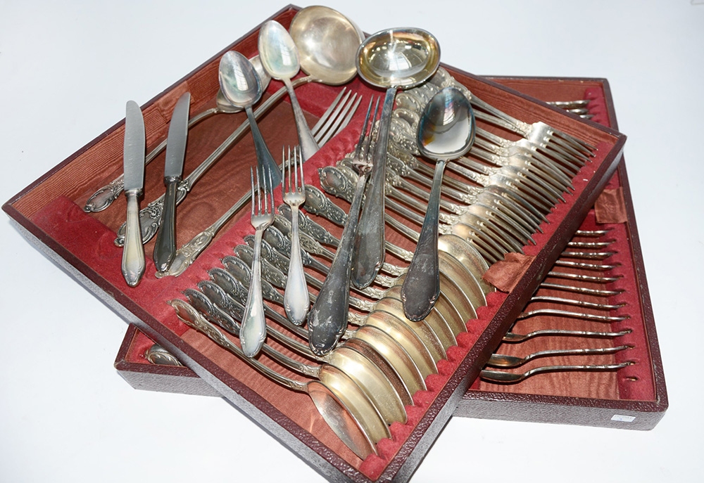 Servizio di posate in metallo argentato composto da dodici forchette, cucchiai e coltelli tavola, dodici forchette e coltelli frutta, undici cucchiai da tè e tre posate a servire in stile floreale marcato "Martin" fine sec. XIX-inizio sec. XX unito ad un servizio di posate in alpacca da sei persone (difetti)