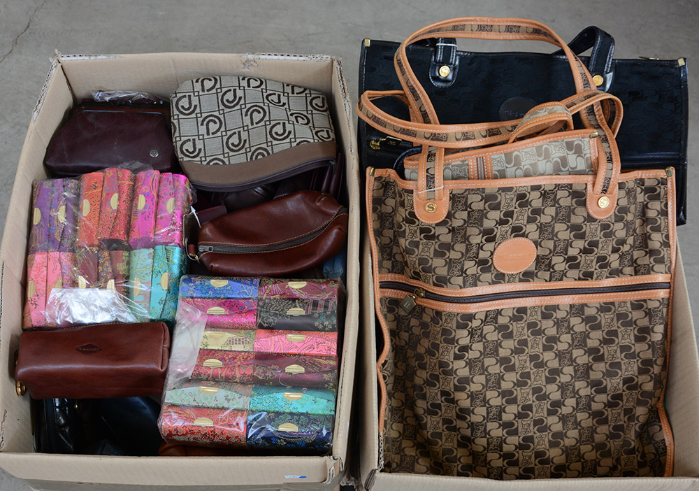 Lotto di due cartoni contenenti numerose borse e portafogli di diverso genere