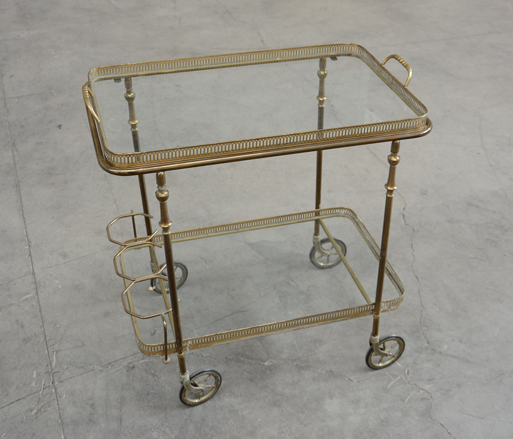 Carrello portaliquori a due ripiani in ottone con piani in vetro