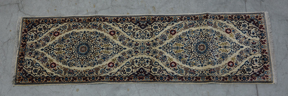 [Tappeti] Tappeto Nain, Persia, sec. XX. Annodato in lana e seta con disegno florale su fondo bianco (cm 197x60)(difetti)