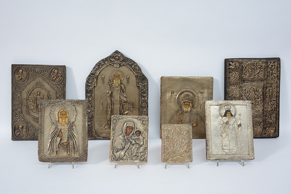 Lotto composto da otto icone diverse con riza in metallo argentato e argento (?) montate su due pannelli in velluto (misure diverse) (difetti)