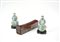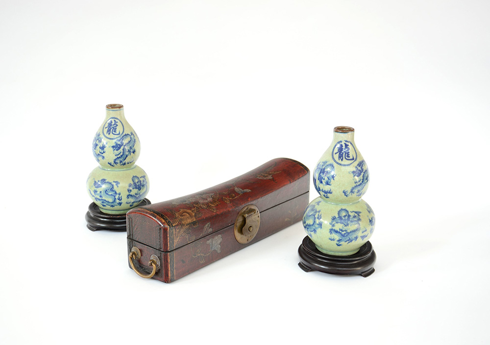Lotto composto da una scatola con coperchio in lacca e due vasi in porcellana a forma di zucca su basi in legno con marchio apocrifo Quangxi (difetti) Cina, sec. XX