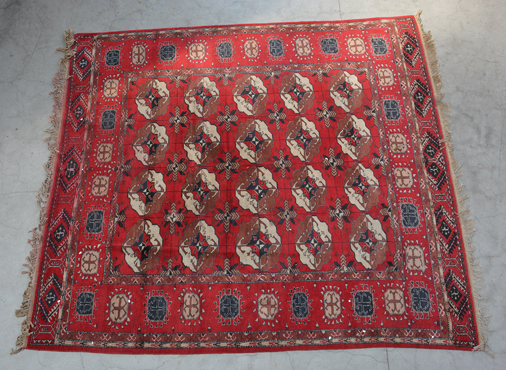 [Tappeti] Tappeto Afghan, sec. XX. Disegno Boukhara nei toni del rosso, bianco e nocciola (cm 295x260) (difetti)
