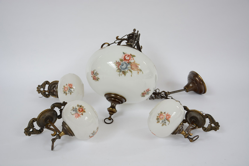 Lotto composto da un lampadarietto e tre applique ad una fiamma in metallo e vetro decorato a fiori (difetti)