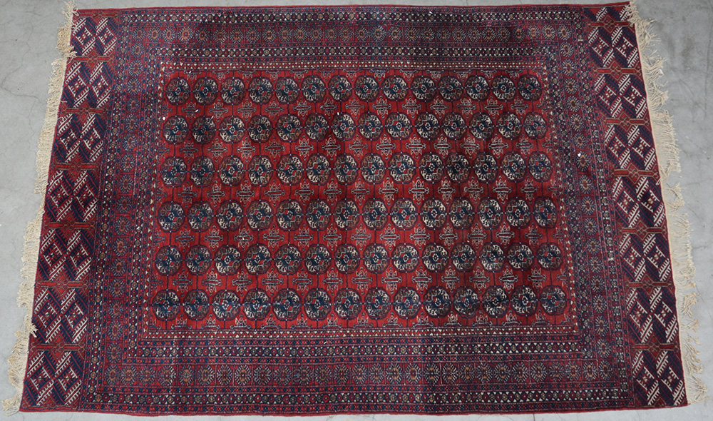[Tappeti] Tappeto Boukhara, Pakistan, sec. XX. Disegno Boukhara a fondo rosso a cinque file di medaglioni (cm 272x191)(difetti)