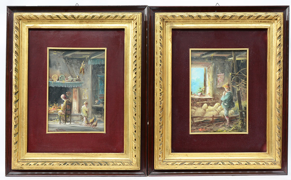 Mario Fattori (1930) "Interno di ovile" e "Interno di cascina" coppia di olii su cartone telato (cm 35x25) firmati in basso, in cornici (difetti)