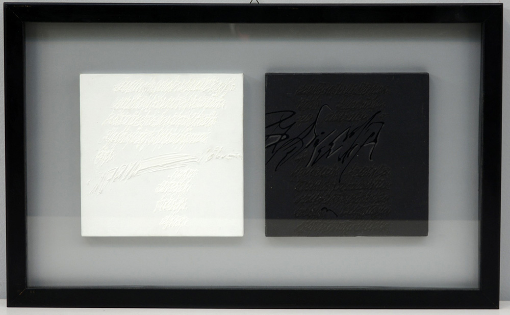 Alessandro Algardi (Milano 1945) "Bianco 21" – "Nero 24", 1995. Lotto composto da due acrilici su tela montati in un'unica cornice (cm 19x19 cad.). Firmate, datate, titolate al retro e timbri della galleria "Transit". Ciascuna opera è accompagnata da certificato di autenticità firmato dall'artista (gennaio 2014)