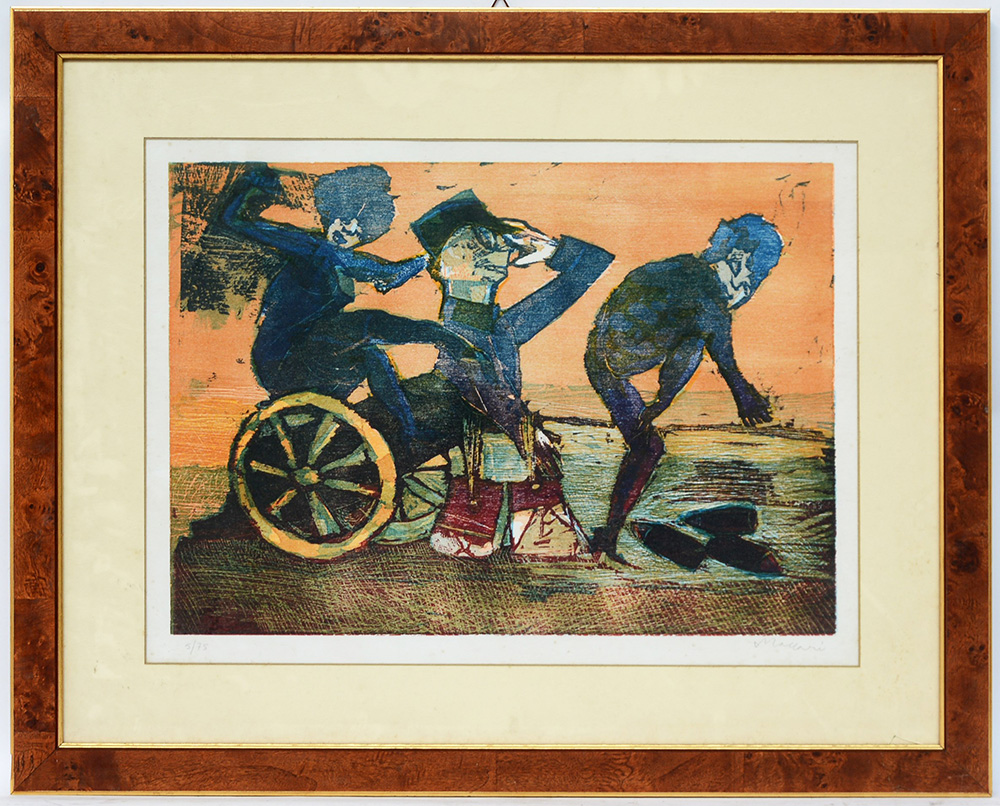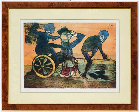 Mino Maccari (Siena 1898 - Roma 1989) "Figure" linoleum a colori (cm 44x60) Firmata e numerata 5/75 in basso a matita. Timbro al retro della Galleria Marescalchi Galleria d'Arte, Bologna. In cornice (difetti)