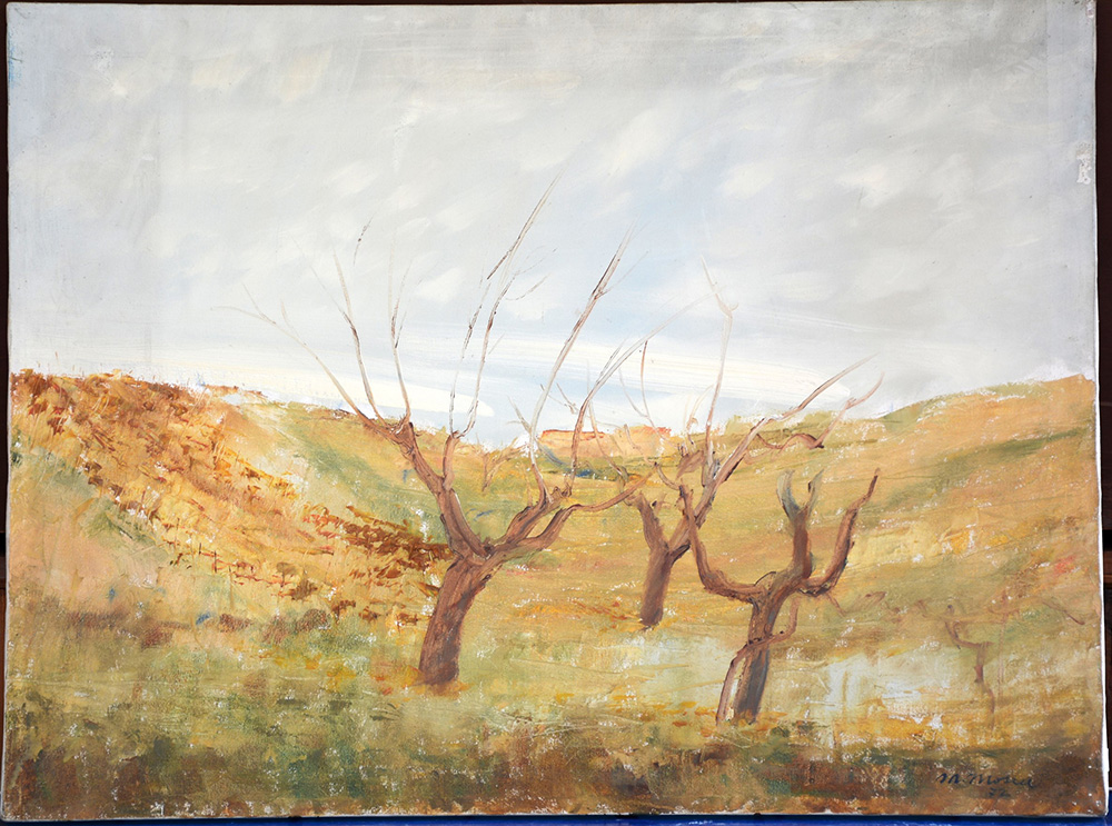 Mosca Mario (Osimo 1940) "Paesaggio marchigiano", 1972, olio su tela (cm 60x80). Firmato e datato in basso a destra. Titolato e datato al retro (difetti)