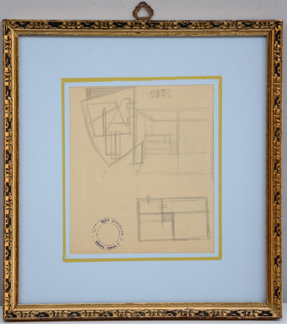 Atanasio Soldati (Parma 1896 - 1953) "Composizione" 1951 matita su carta, cm 17x15 Provenienza Collezione Maria Soldati Collezione privata Opera accompagnata da certificato di autenticità su fotografia rilasciato dall'Archivio Storico dell'Opera di Atanasio Soldati -EN "Composizione" 1951 matita su carta, cm 17x15 Provenienza Collezione Maria Soldati Collezione privata Opera accompagnata da certificato di autenticità su fotografia rilasciato dall'Archivio Storico dell'Opera di Atanasio Soldati