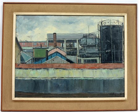 Firma indecifrata "Varazze, complesso gas" olio su tela (cm 50x65) firmato in basso a destra, in cornice (difetti)