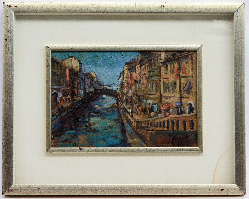 Giampietro Maggi (Milano 1934) "Milano, il Naviglio" olio su tela (cm 20x30) firmato in basso a destra, firmato e titolato al retro, in cornice (difetti)