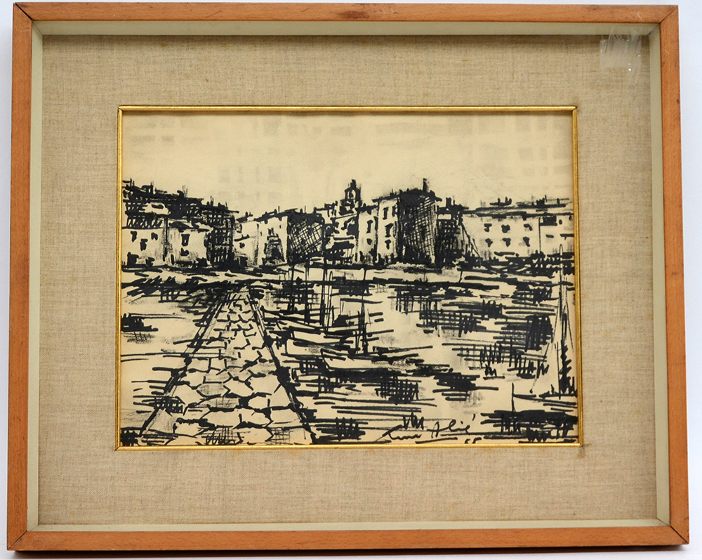Ignoto, sec. XX "Porto" 1955. Disegno a pennarello su cartoncino (cm 25x32) firmato "René Alie" e datato in basso a destra, in cornice (difetti)