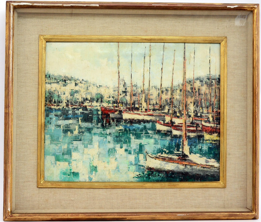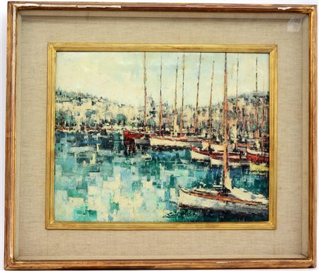 Ignoto, sec. XX "Barche nel porto" olio su tela (cm 38x46) firmato "René...