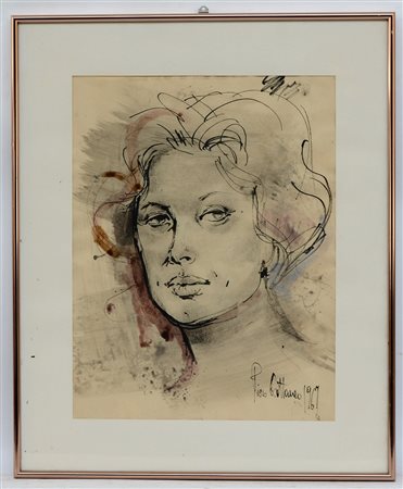 Piero Cattaneo (Bergamo 1929 - 2003) "Ritratto di donna" 1967 tecnica mista su carta (cm 40x32) Firmato e datato in basso a destra. In cornice (difetti)