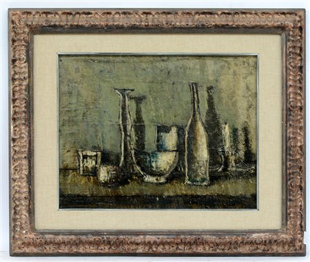 Egidio Lazzarini "Composizione con bottiglie" 1946 tecnica mista su masonite (cm 27x37) Firmato e datato in basso a destra. In cornice (difetti)