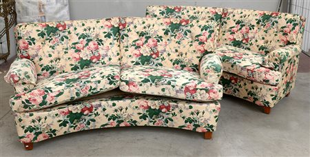 Coppia di divani a forma curva a tre posti rivestiti con tessuti a fiori