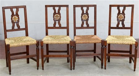 Gruppo di quattro sedie in noce con schienale squadrato e cartella intagliata e traforata a fregio gambette scanalate, (lievi differenze) sec XIX
