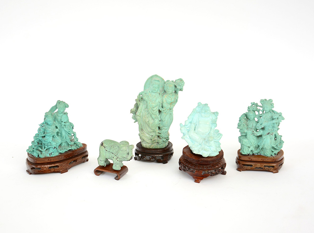 Lotto di cinque sculturine orientali in pasta di turchese (misure diverse) (difetti)