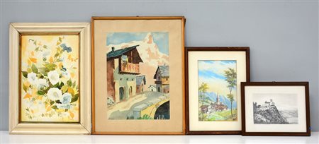 Lotto di sei quadri dipinti con tecniche differenti raffiguranti paesaggi e...