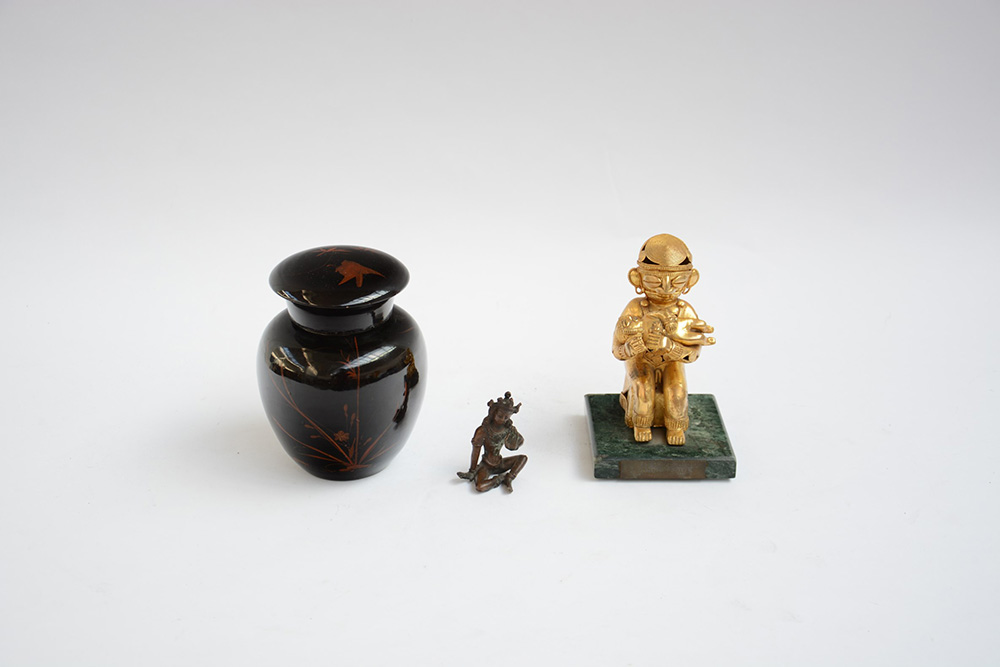 Lotto composto da un contenitore con coperchio in lacca cinese, una Buddha thailandese in bronzo (h cm 7) e una scultura precolombiana in metallo dorato (difetti)