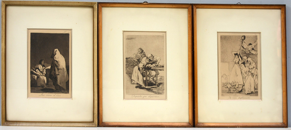 Lotto di tre riproduzioni da Francisco Goya, in cornici (difetti)