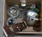 Cartone contenente un vaso in vetro, un attaccapanni e alcuni oggetti per la...