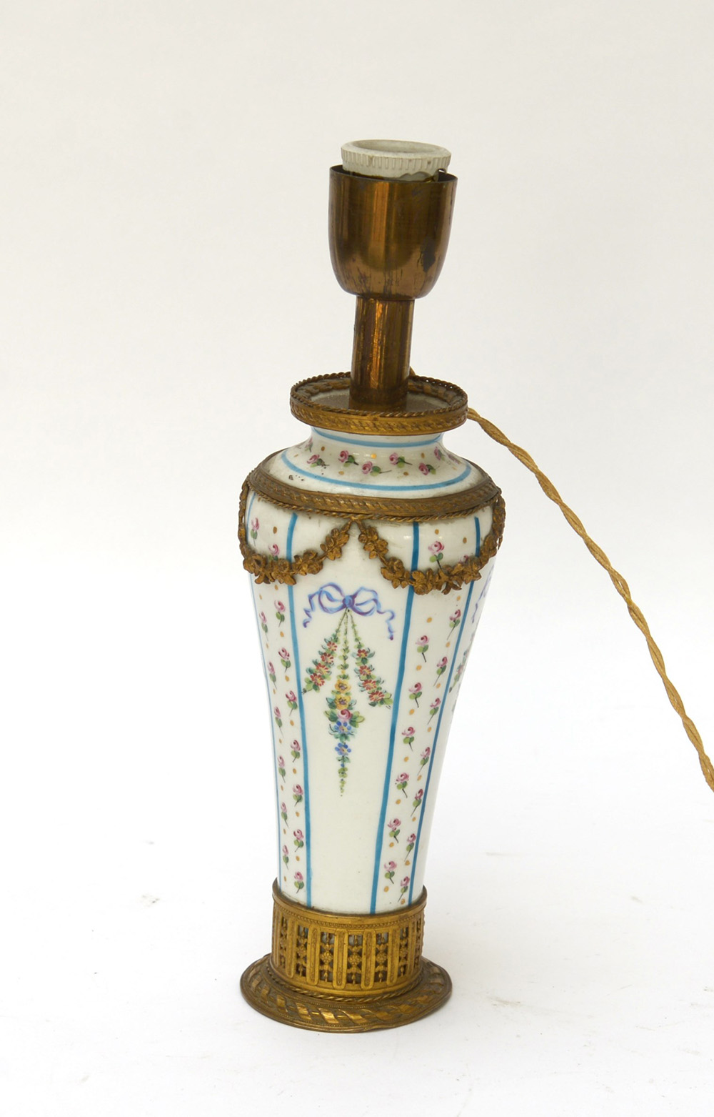 Vasetto in porcellana policroma con base e ghiera in bronzo dorato, montato a luce elettrica (h cm 30)(difetti)