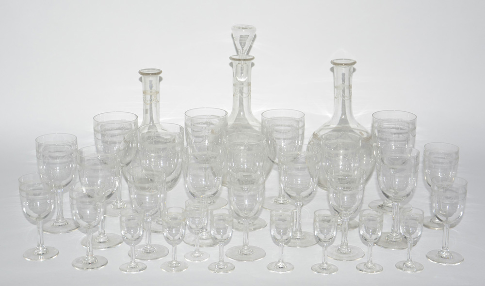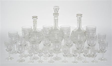 Lotto composto da tre bottiglie (una con tappo) e trenta bicchieri in vetro inciso a festoni (difetti)