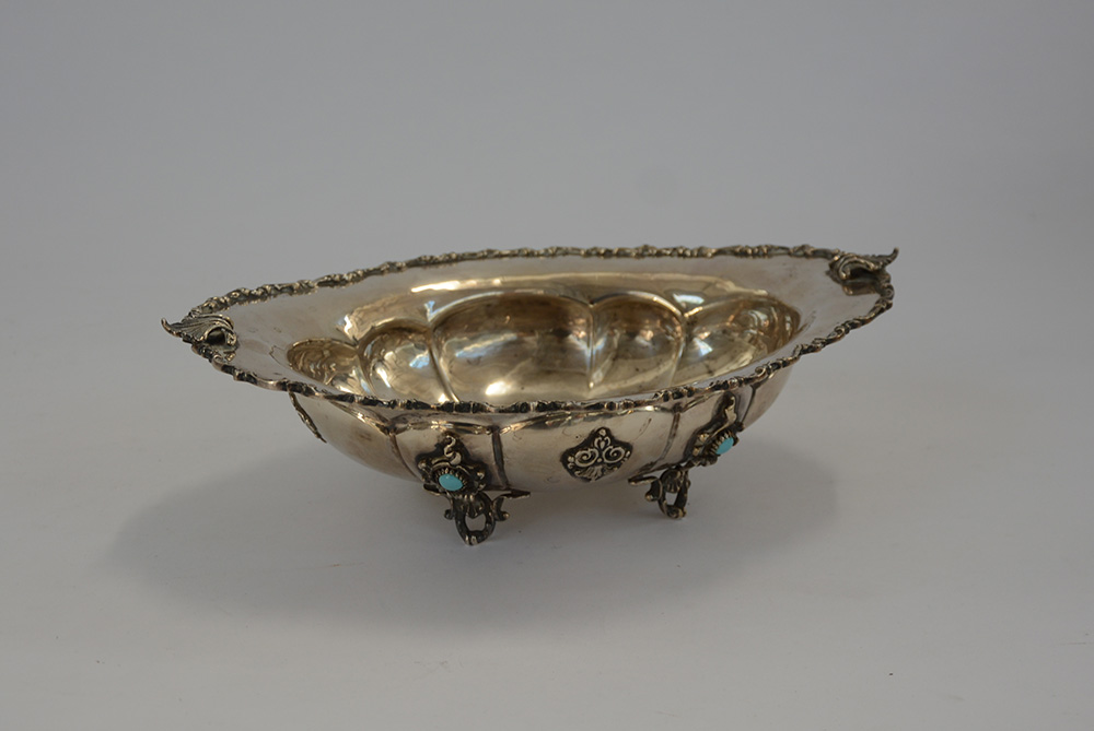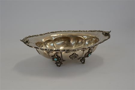 Centrotavola ovale in argento con bordo sagomato e cesellato, con cabochon in turchese. Italia, sec. XX. Marchio del Fascio (?) (gr 500 circa) (l cm 29,5) (lievi difetti)