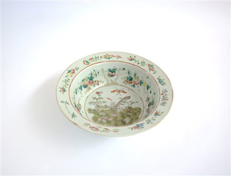 Bacile in porcellana Famiglia Rosa decorato con farfalle tra frutti e motivi floreali Cina, sec. XIX (d. 29.5 cm.)(lievi difetti)