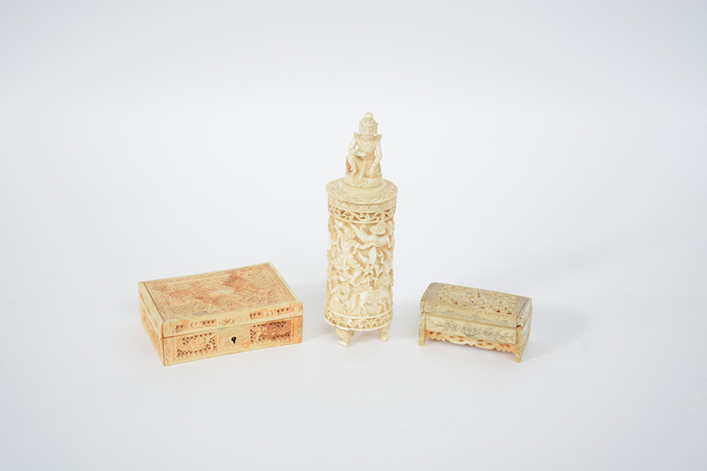 Lotto composto da un vasetto e due scatole con coperchio in avorio traforato e inciso, misure diverse (difetti) Cina, sec. XX