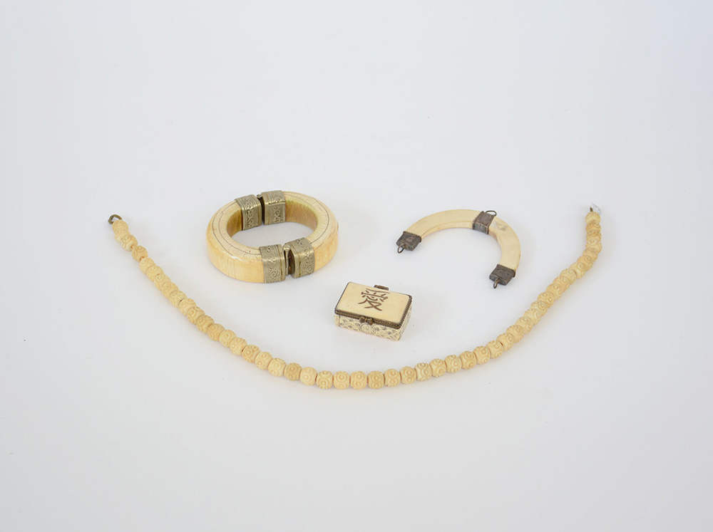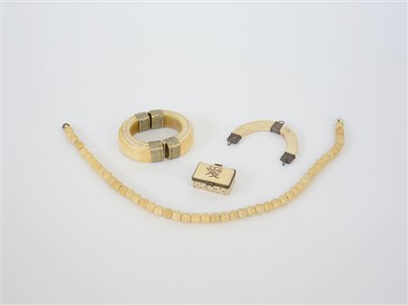 Arte orientale, lotto composto da un bracciale, un pendente, una scatolina con coperchio e una collana di diverso decoro e misure (difetti)