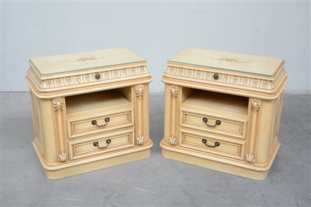 Coppia di comodini a tre cassetti e un vano sottopiano in legno laccato color beige con decori floreali. Piani in vetro (cm 65x59x34) (difetti)