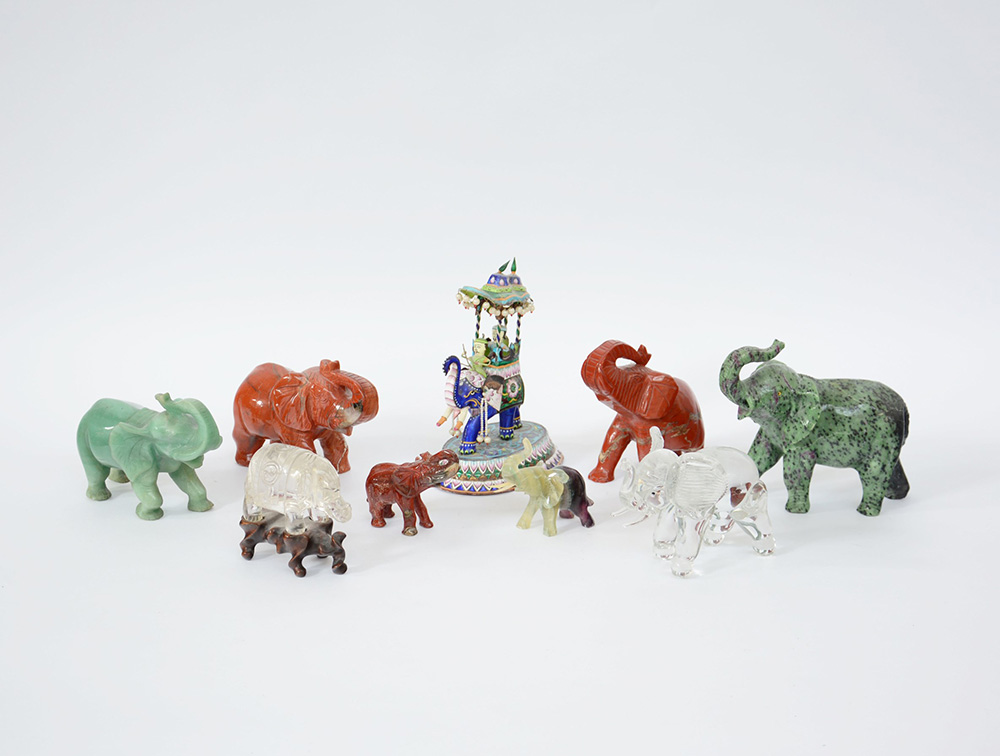 Arte orientale, lotto composto da nove sculture di misure diverse raffiguranti elefanti in pietra dura, vetro e smalto (difetti e mancanze)