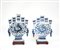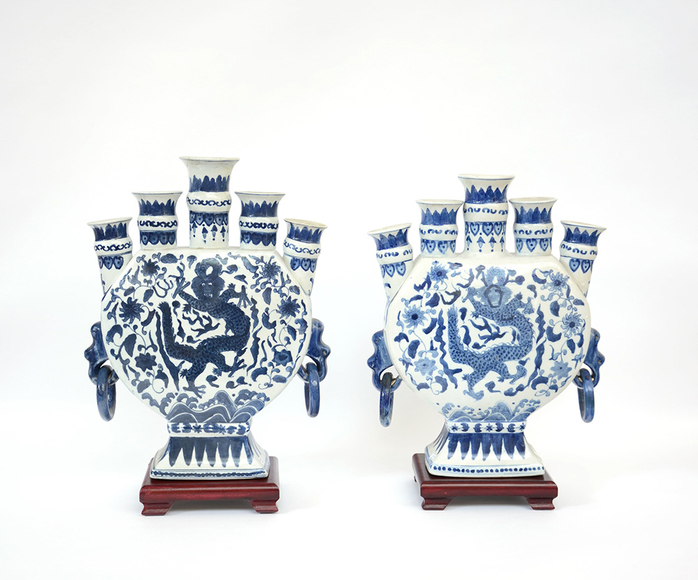 Coppia di tulipaniere in ceramica biansate con anelli in sospensione decorate nei toni del blu a dragoni, con basi in legno (difetti) Cina, sec. XX (h. 43 cm.)