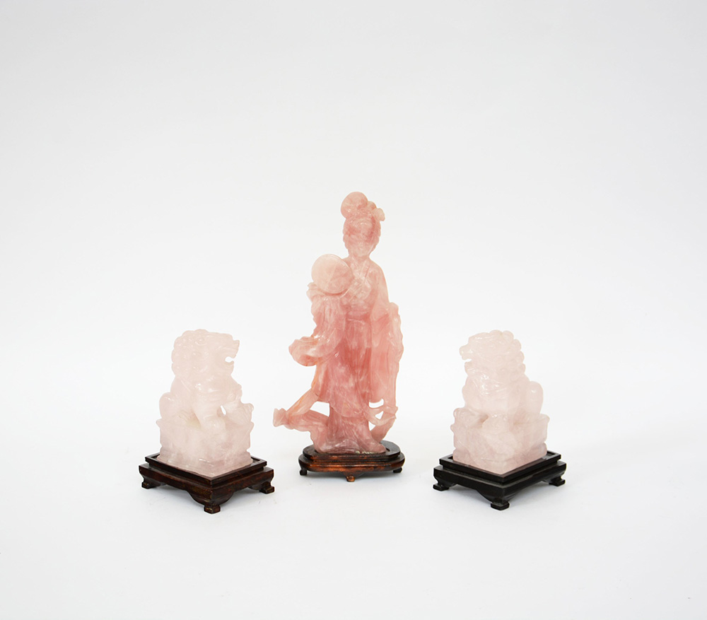 Arte orientale, lotto di tre sculture con misure diverse in quarzo rosa raffiguranti leoni buddhisti e Guanyin con basi in legno (difetti)