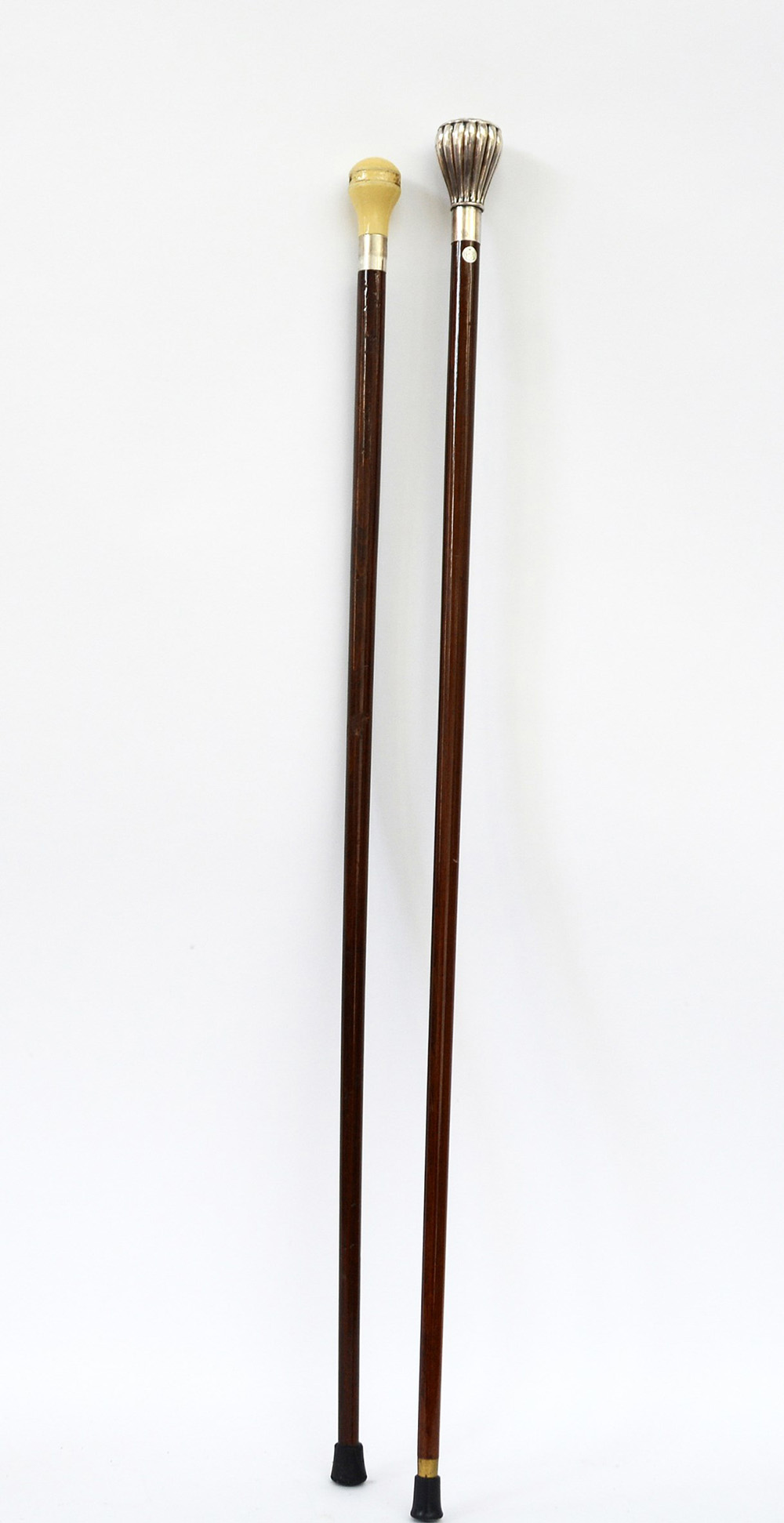 Lotto di due bastoni con pomoli in metallo argentato e osso (misure diverse) (difetti)