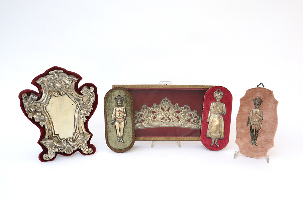 Lotto composto da un fregio, tre ex voto con figure ed un cartagloria in metallo sbalzato e argentato, montati su pannello in velluto (difetti)