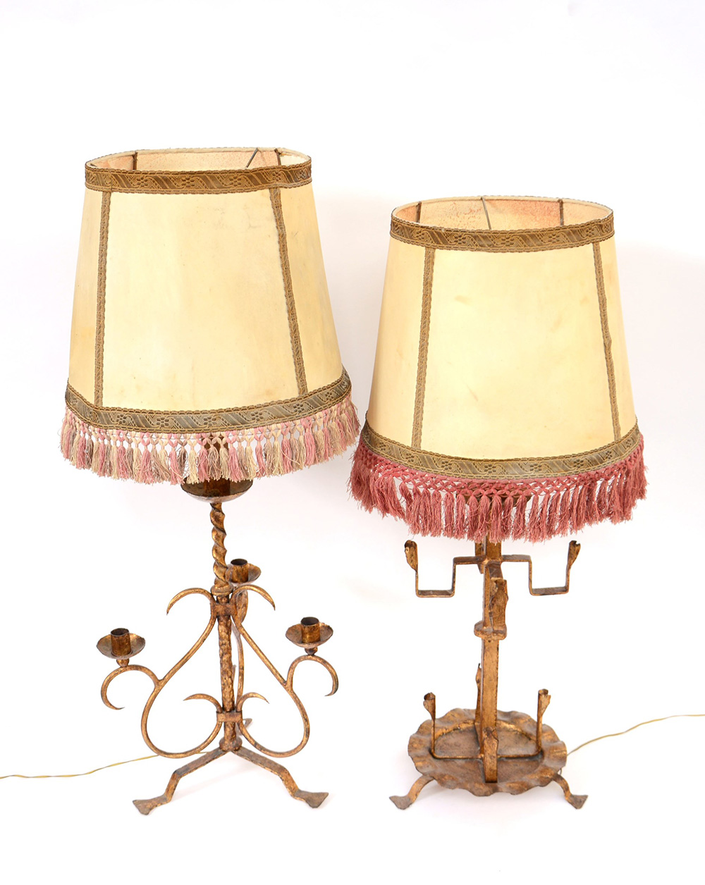 Lotto composto da due lampade da tavolo in metallo dorato con paralumi (misure diverse) (difetti)