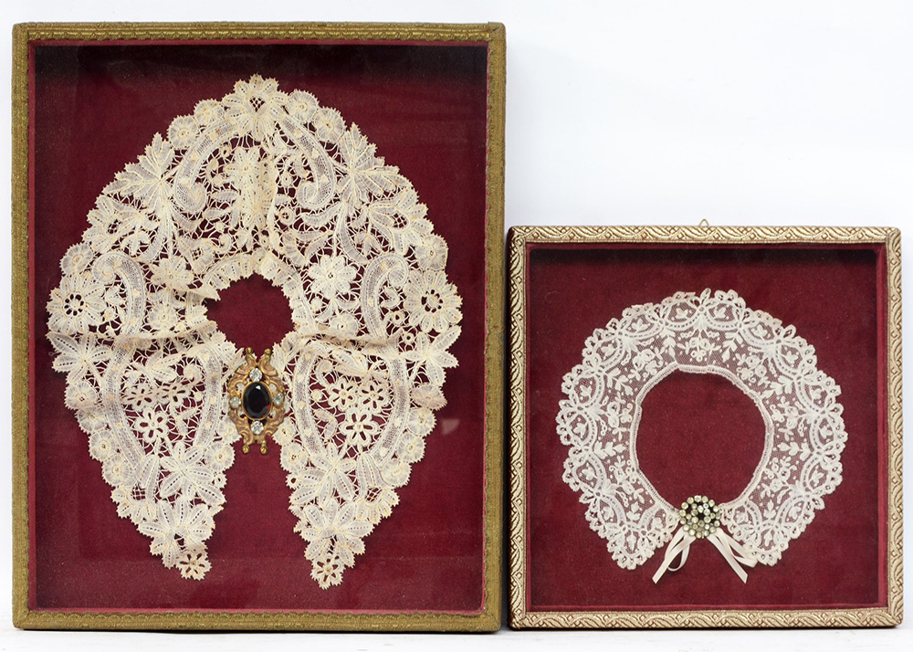 [Tappeti] Lotto di due colletti in pizzo ad ago per signora e per bambina con chiusura bijoux, contenuti teca (lievi difetti)